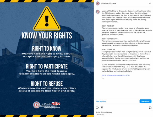 To raise awareness and improve workplace safety, IHSA is leading Falls Awareness Week from May 5 to 9, 2025. IUOE Local 793 supports this initiative and remains committed to protecting every worker building and maintaining Ontario.