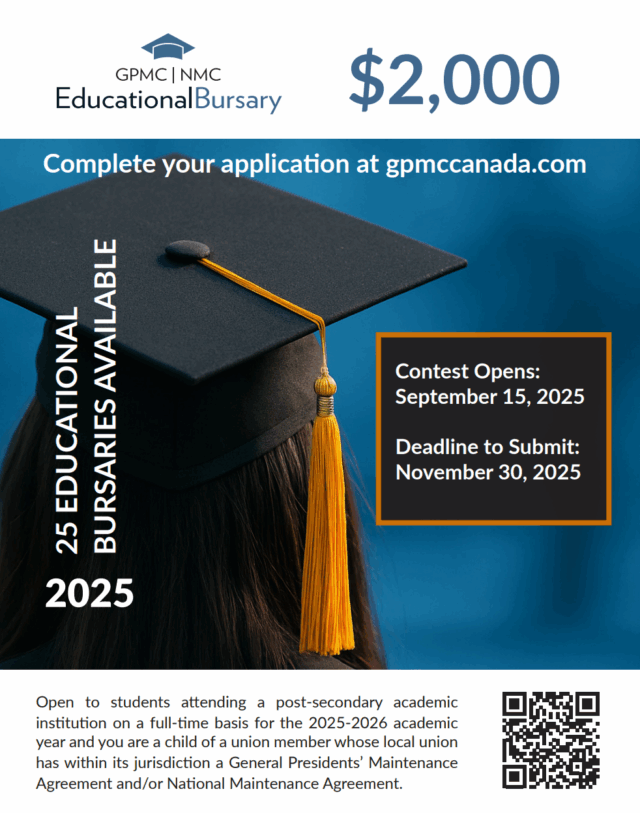 The GPMC | NMC offers a bursary to assist children of members of Canada’s Building Trade Unions with the cost of their post-secondary education.