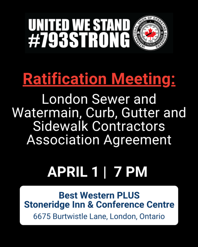 We will be holding a Ratification Meeting on Wednesday April 1, 2026 at 7:00 pm at the Best Western PLUS Stoneridge Inn & Conference Centre located at 6675 Burtwistle Lane, London, ON.