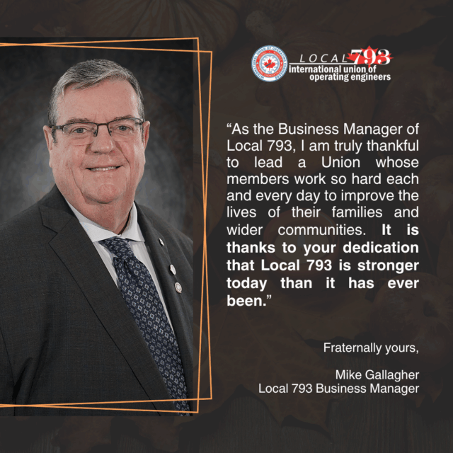 As the Business Manager of Local 793, I am truly thankful to lead a Union whose members work so hard each and every day to improve the lives of their families and wider communities. It is thanks to your dedication that Local 793 is stronger today than it has ever been.