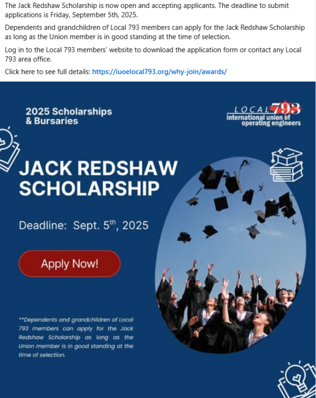 Dependents and grandchildren of Local 793 members can apply for the Jack Redshaw Scholarship as long as the Union member is in good standing at the time of selection.