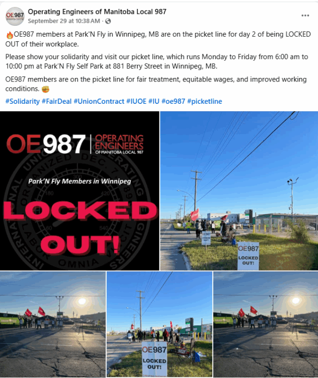 We stand in solidarity with Operating Engineers of Manitoba Local 987 members at Park ‘N Fly in Winnipeg who are locked out of their workplace!